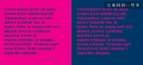 有些色彩組合只適合運用在前景色的部分,而不適合做背景色。舉個例子來說,深藍色的文字搭配粉紅色的背景與粉紅色的文字搭配深藍色的背景,都是使用兩種一樣的顏色,但用在不同的部分則影響了它的可讀性和閱讀的舒適度。重要的是,不僅要使用良好的色彩組合,而且要把它用在頁面中的合適元素上。