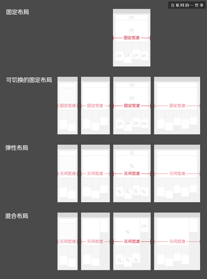 采用何種方式實現布局設計,也有不同的方式,這里基于頁面的實現單位而言,分為四種類型:固定布局、可切換的固定布局、彈性布局、混合布局。